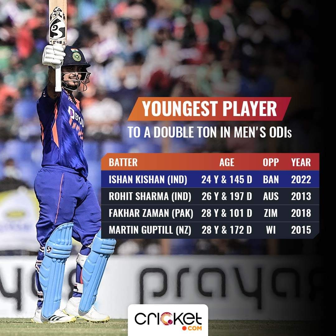 -At the age of 24 years and 145 days, Kishan became the youngest double centurion in ODIs. Previously, Rohit Sharma at 26 years and 197 days, held the record.