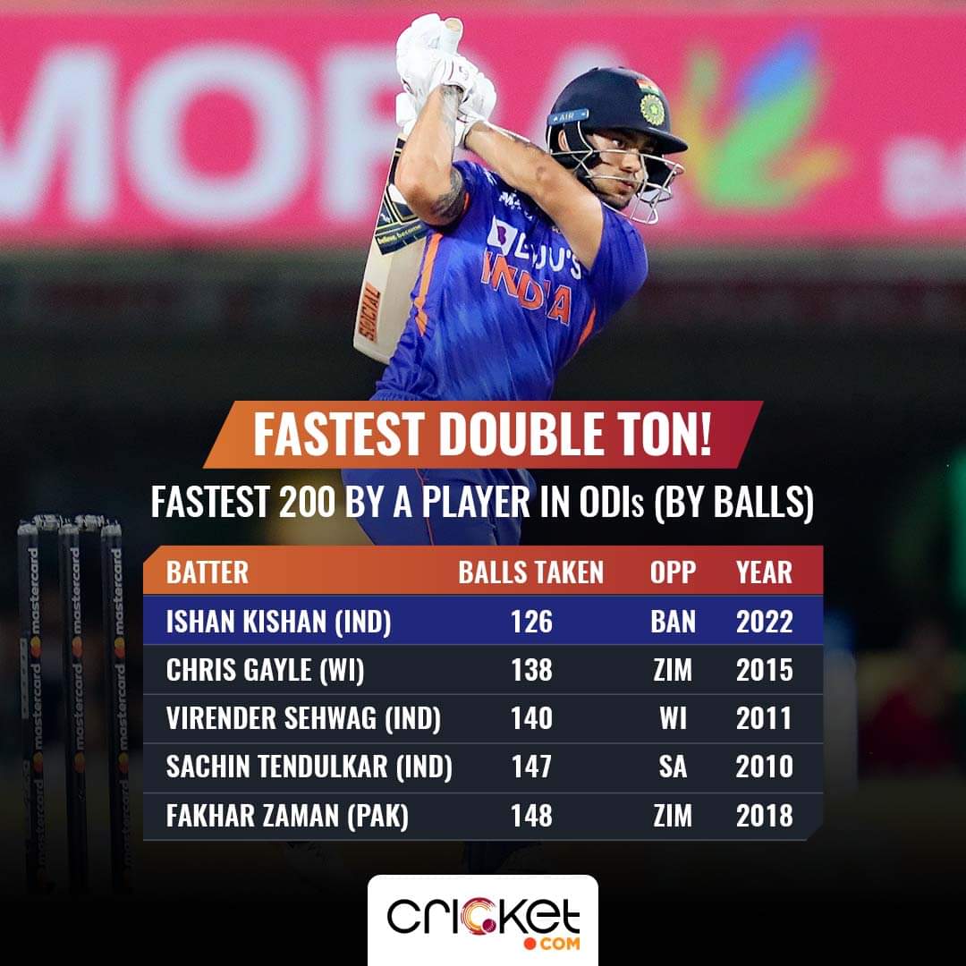 -Further, Kishan registered 150 in just 103 balls, the fastest by an Indian. Previously, Virender Sehwag against West Indies had reached the milestone in 112 balls.
