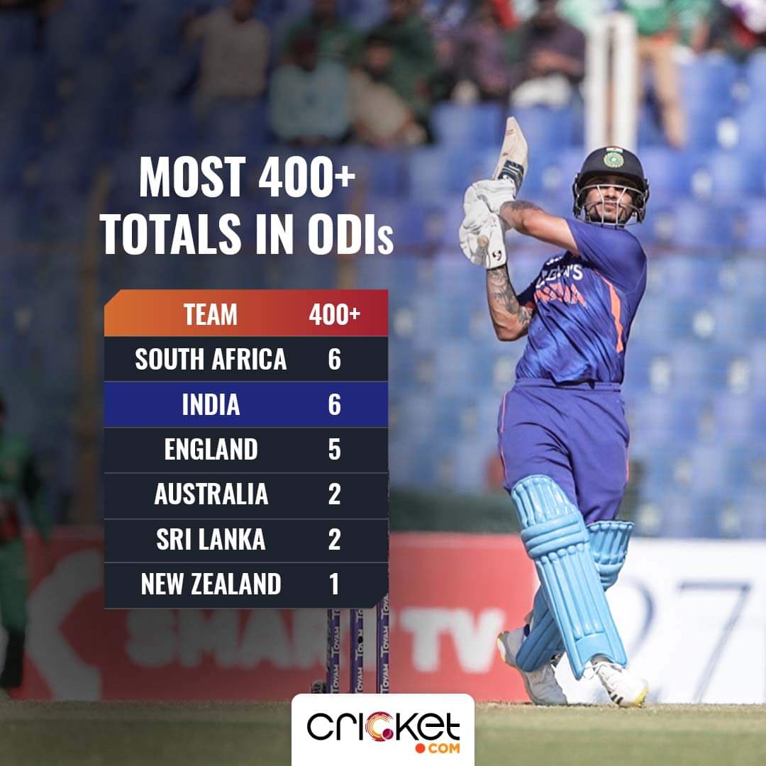 On the back of a double ton by Kishan and century by Kohli, India hoisted 409/8. In ODIs, this was the sixth time they had posted 400+ total, the joint most alongside South Africa.