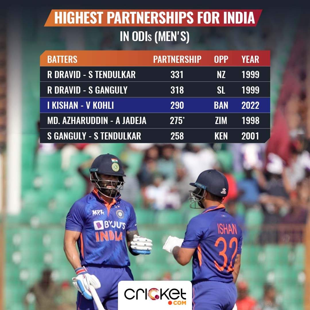 The second wicket partnership between Kohli and Kishan, hoisted 290 runs, the third best for any wicket for India in ODIs. The top two belong to Rahul Dravid-Sachin Tendulkar (331) against New Zealand in 1999 and Dravid-Ganguly (318) against Sri Lanka in 1999 World Cup.