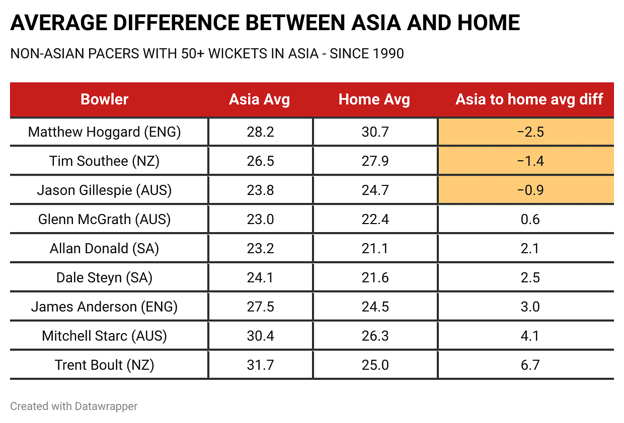 -Southee has 58 wickets in Asia at an average of 26.5, which is better than his home record (226 wickets at 27.9). In Tests since 1990, among nine non-subcontinent pacers who have bagged 50+ wickets in Asia, only three, including Southee, average better in Asia than at home.