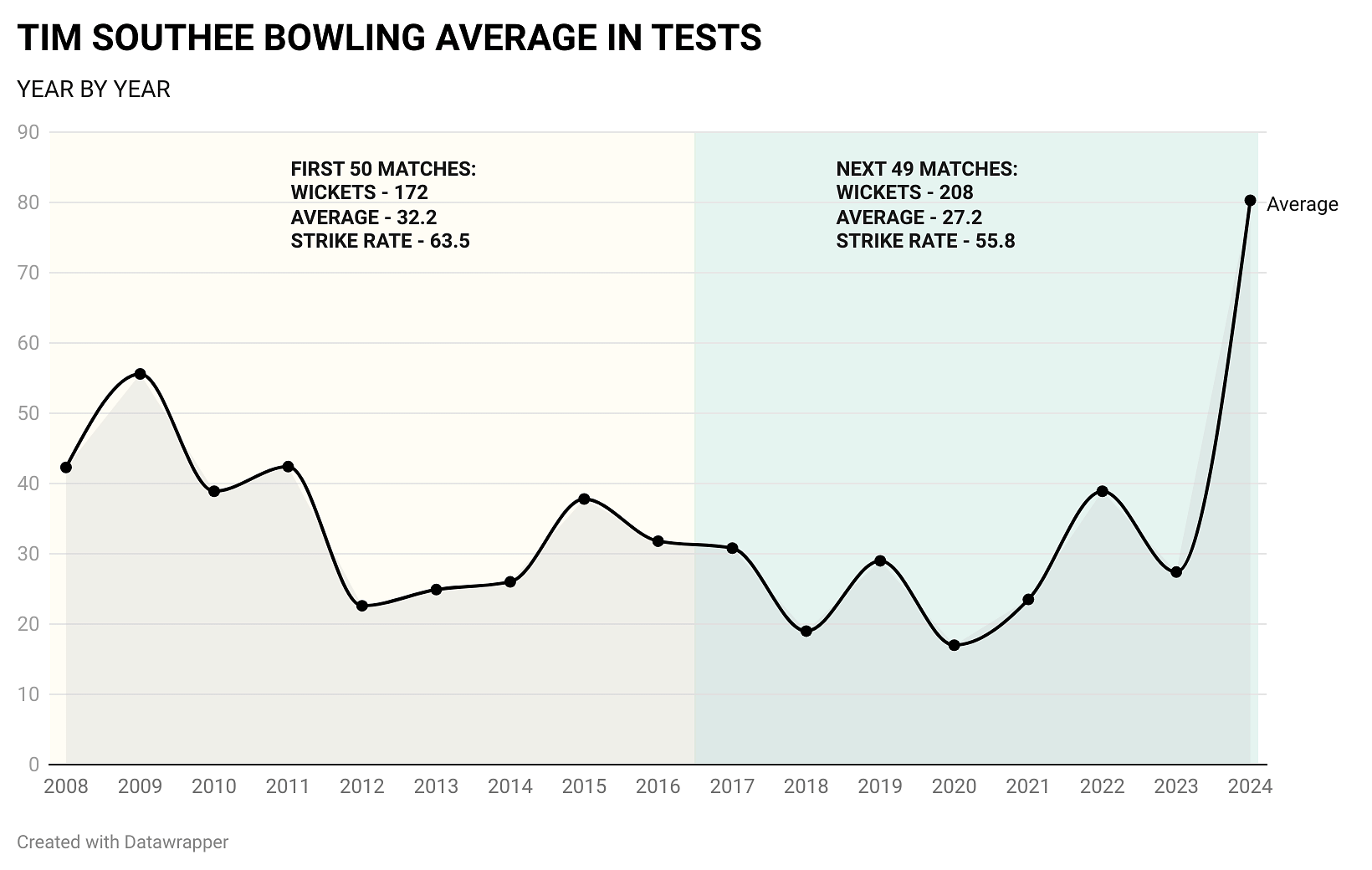 It was the year 2012 in which he started to pick heaps of wickets. From 2012 until 2023, Southee had 15+ wickets each year, 20+ wickets in 11 years, and 25+ wickets in nine years out of the 12.