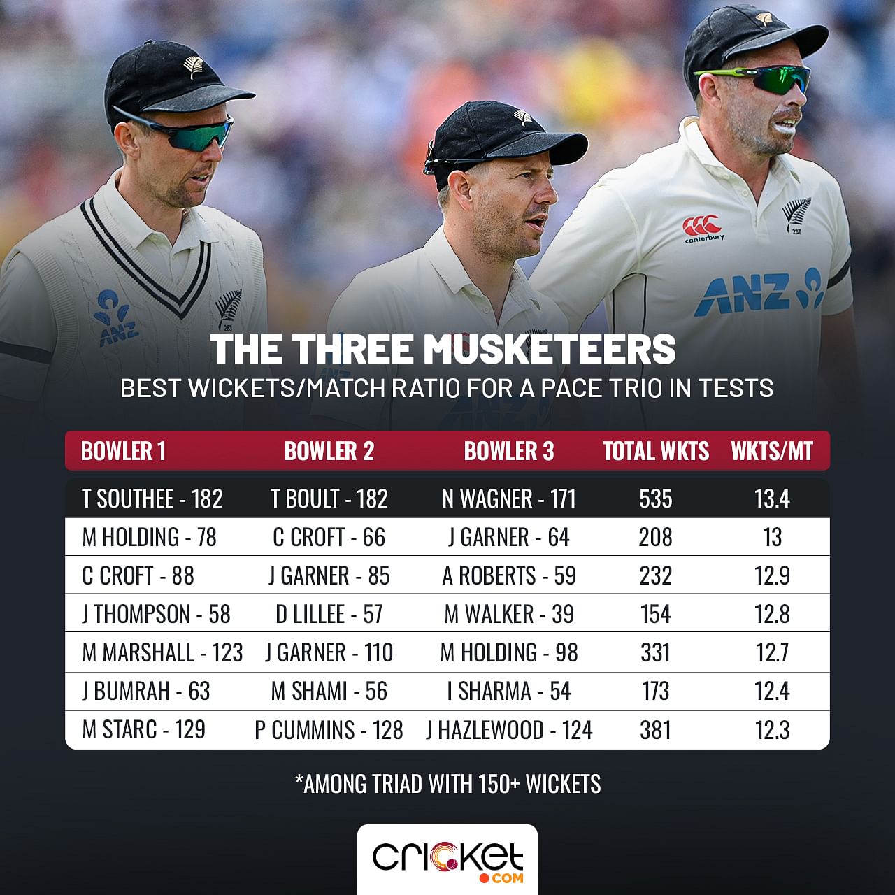 -The trio of Southee, Trent Boult, and Neil Wagner have bagged 535 wickets while bowling together. These are the third-most by a pace trio. James Anderson, Stuart Broad, and Ben Stokes lead the list with 568.