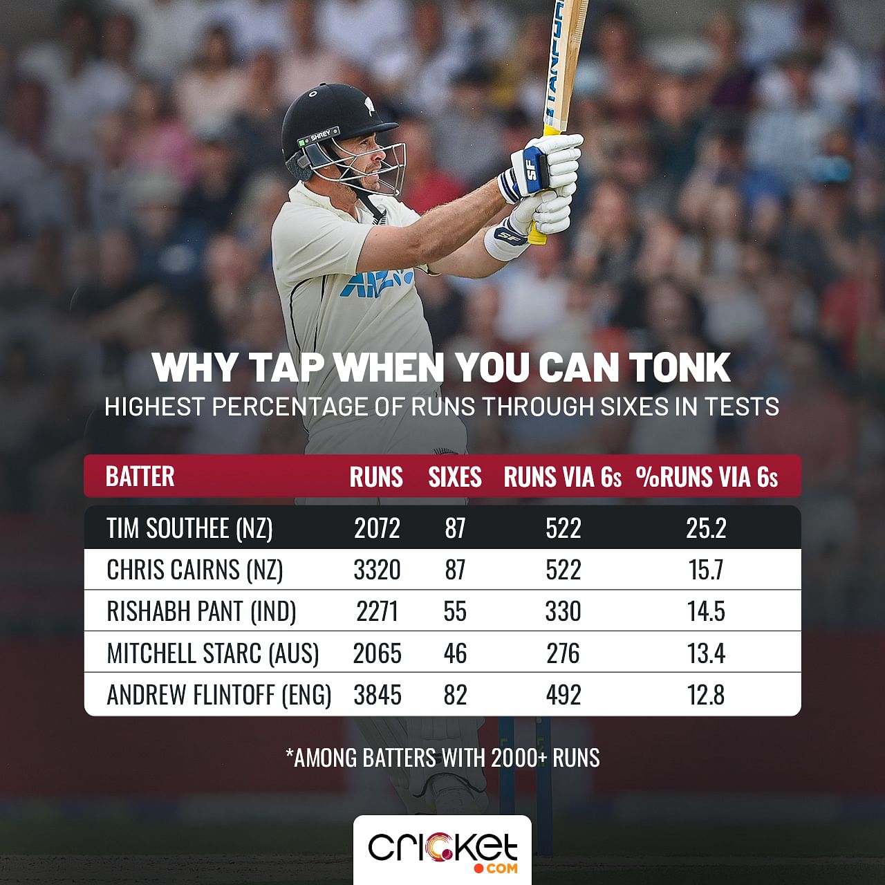 -In his Test career, Southee has scored 25.1% of his runs through sixes, the most among all batters with 50+ sixes.