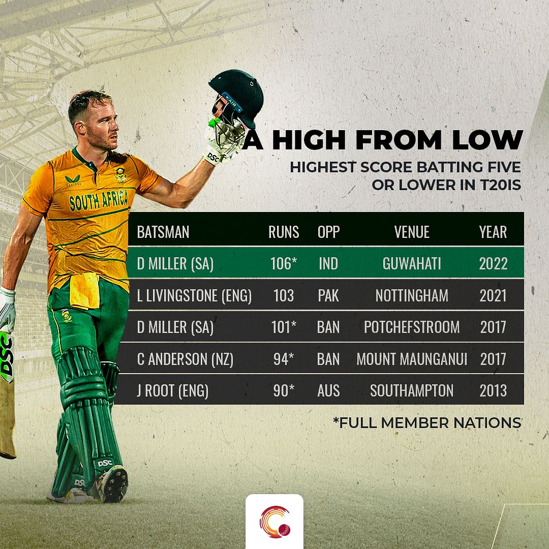 -Miller became the first batter in T20Is to have scored multiple centuries batting five or lower. His first century came against Bangladesh in 2017.