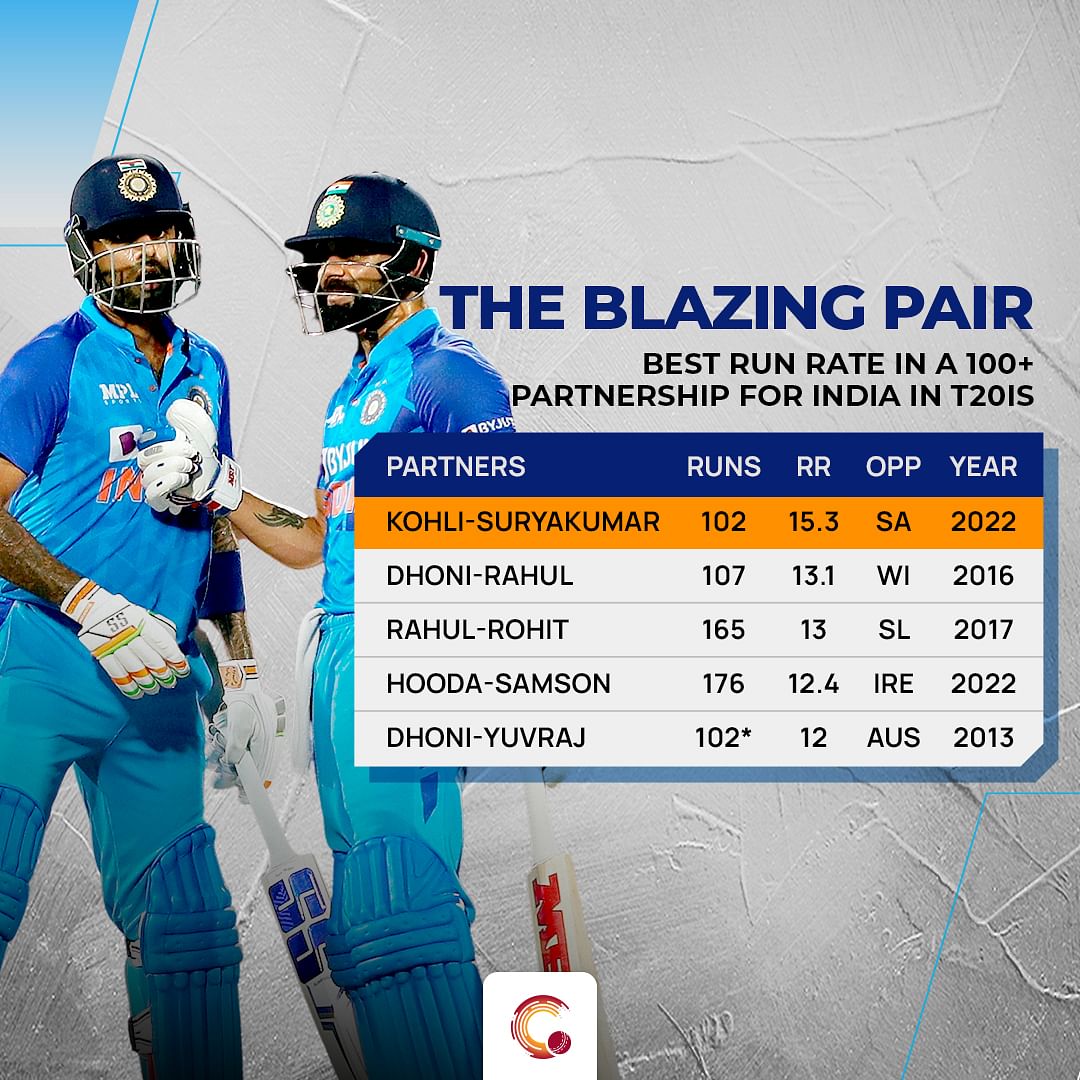 The 100-run partnership between Kohli and Surya for the third wicket came off just 41 balls, which is the fastest for India. Their 102-run partnership ended at a run rate of 15.3. This is the best run rate in a 100-run partnership between a pair for India in T20Is.