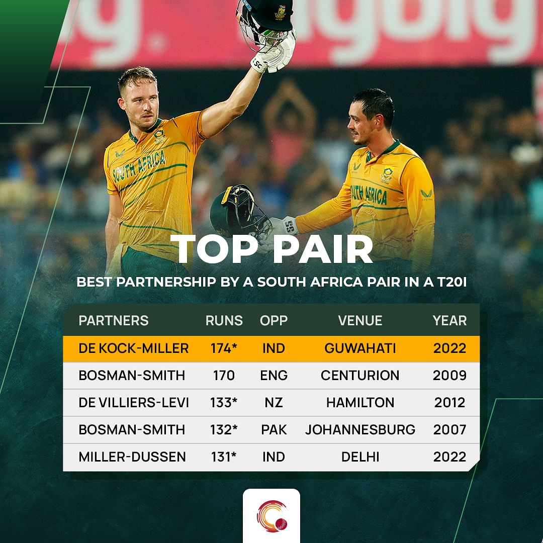 It’s a shame that the biggest partnership for South Africa in T20Is came in a loss. Miller and de Kock hoisted an unbeaten partnership of 174 for the fourth wicket, their biggest in T20Is. Also, this is the highest partnership against India in T20Is. Previously, Babar Azam and Mohammad Rizwan’s partnership of 152 in the 2021 T20 World Cup, held the record.