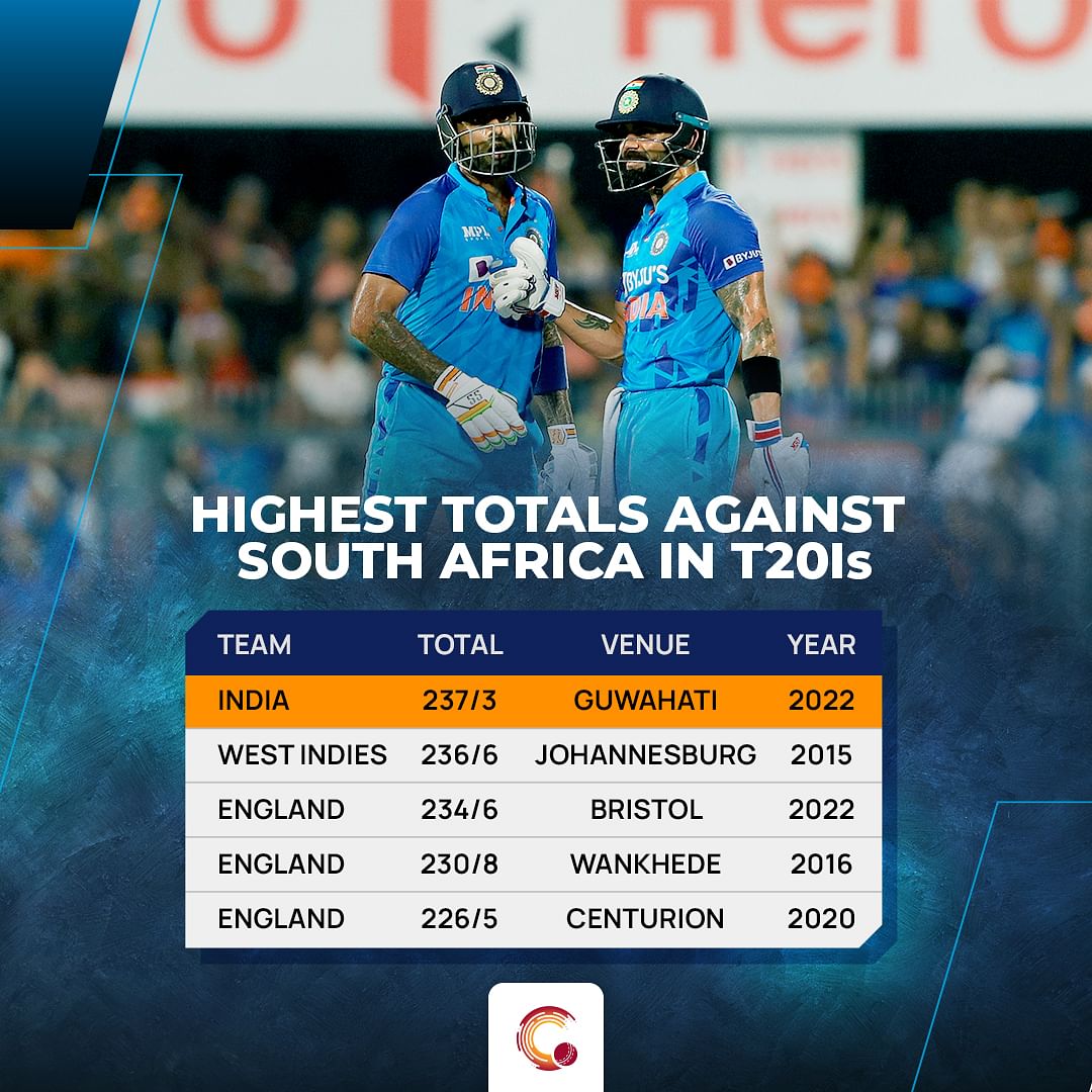India’s total of 237/3, is the highest total against South Africa in T20Is. West Indies in 2015 in Johannesburg, had scored 236/6, the highest then.