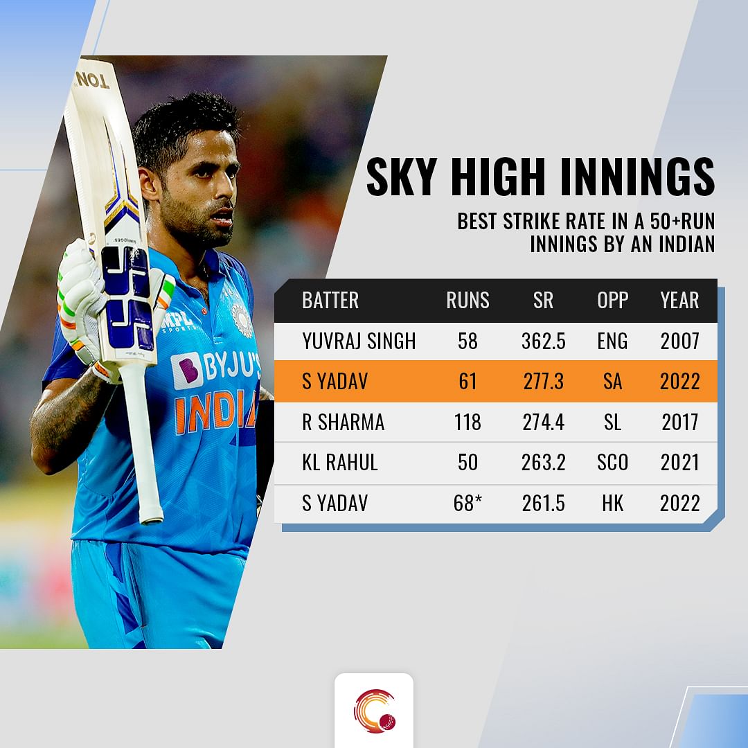 -Surya ended his innings at a strike rate of 277.3. Among Indians who have scored 50+ runs in an innings, only Yuvraj Singh in his monumental knock against England in 2007 had a higher strike rate (362.5).