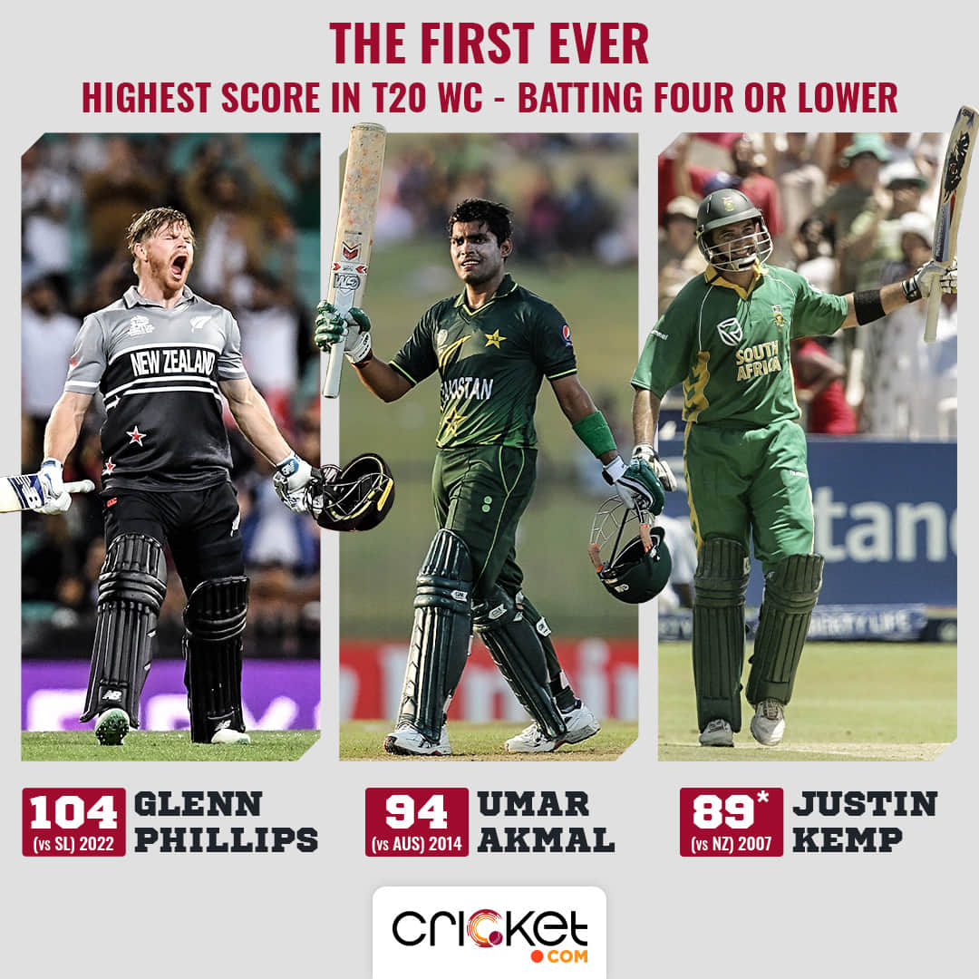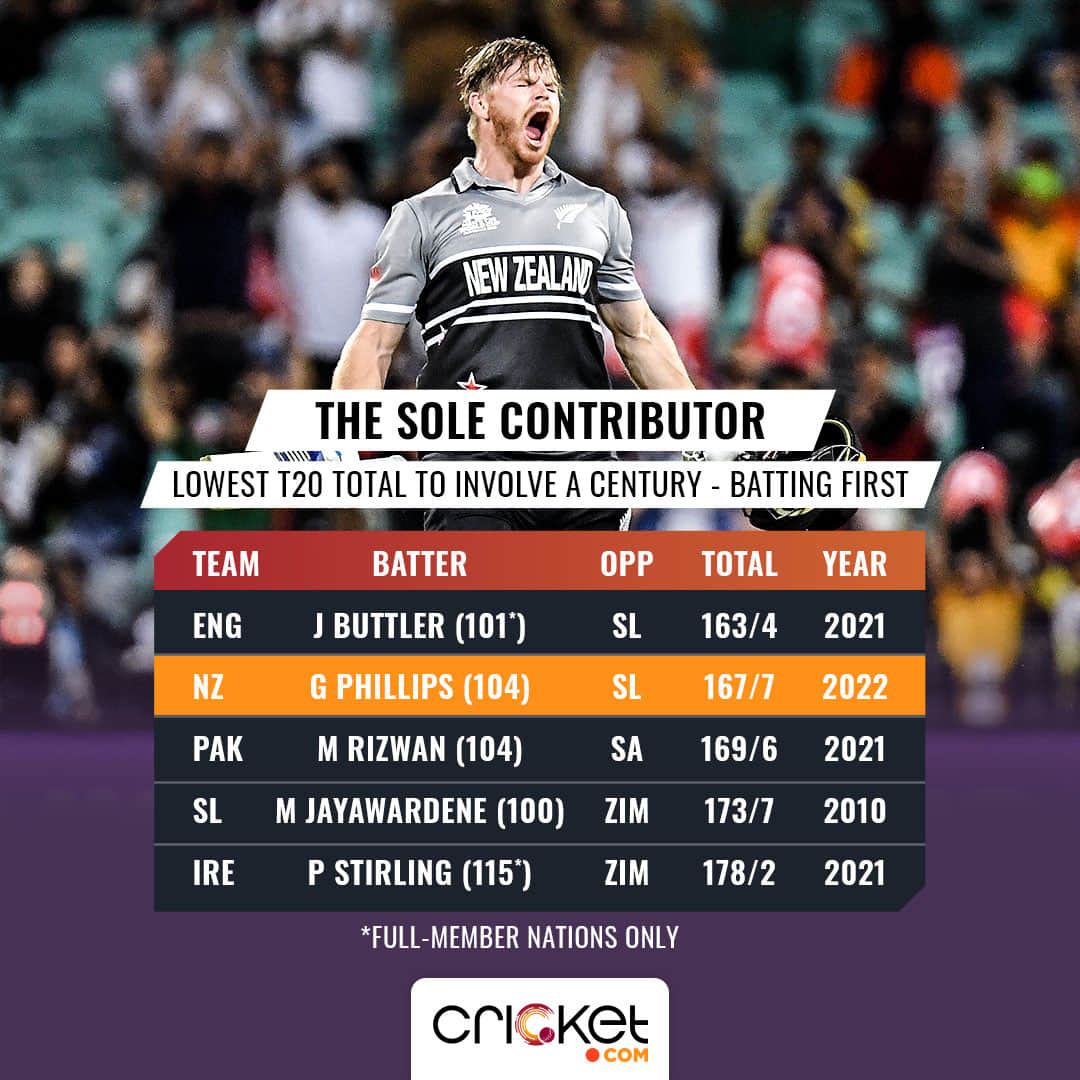 By scoring a 64-ball 104, Phillips became the first batsman in the T20 World Cup, to hit a century batting four or lower. He also became the second Kiwi batter after Brendon McCullum in 2012 against Bangladesh in Pallekele, to hit a century in WC. Overall in T20Is, he is now the fourth Blackcaps batsman to hit multiple centuries. Colin Munro with three leads the list. Martin Guptill and Brendon McCullum, also have two each.