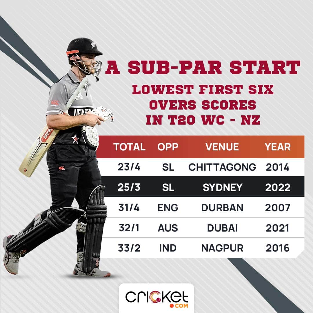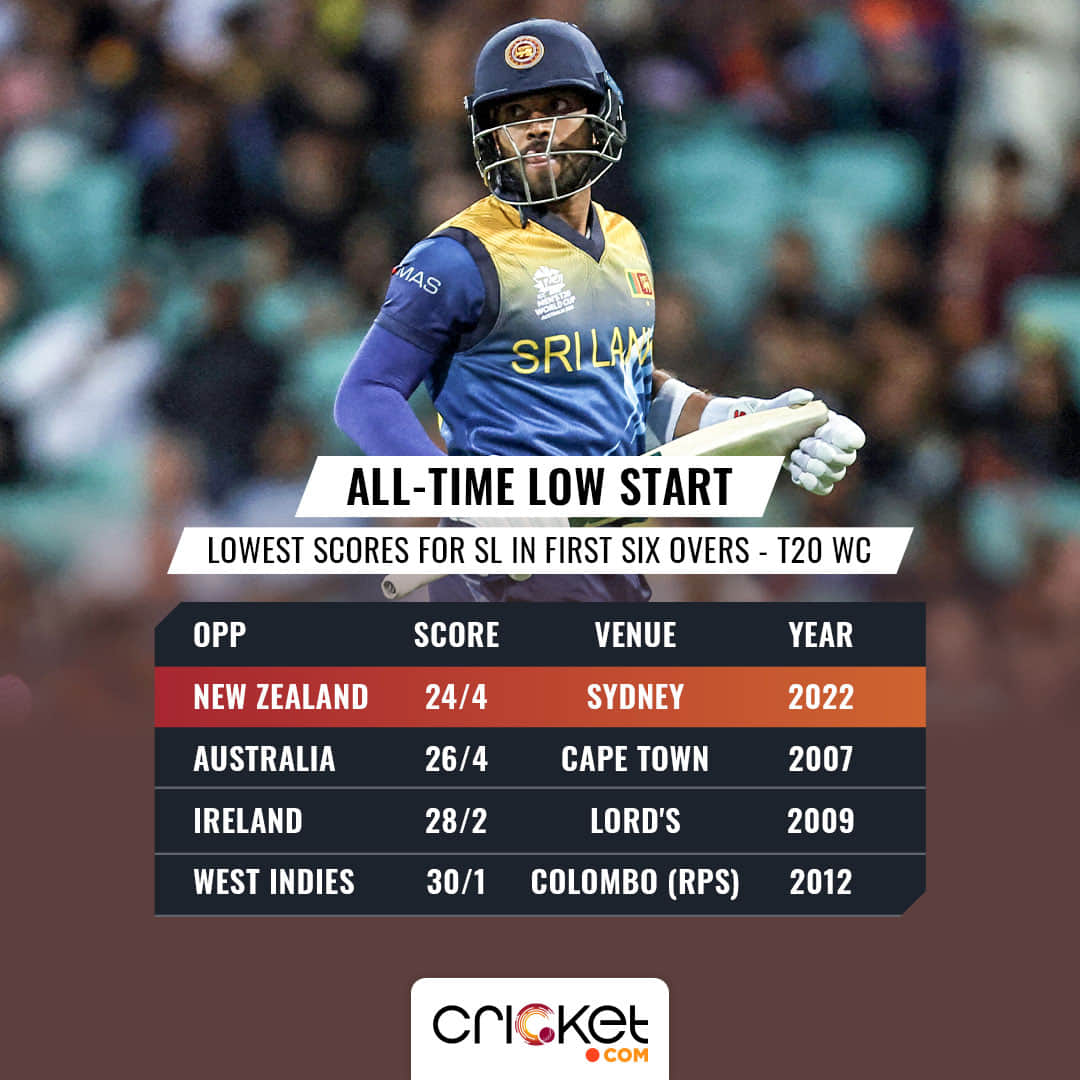 In the chase, Sri Lanka were in a similar state. In fact, they were in deeper trouble as they were chasing. They had lost one more wicket and had scored a run less. For them, this is the lowest power play total in T20 WC. In this edition, Sri Lanka’s score of 24/4 is the second and New Zealand’s 25/3 is the third worst.