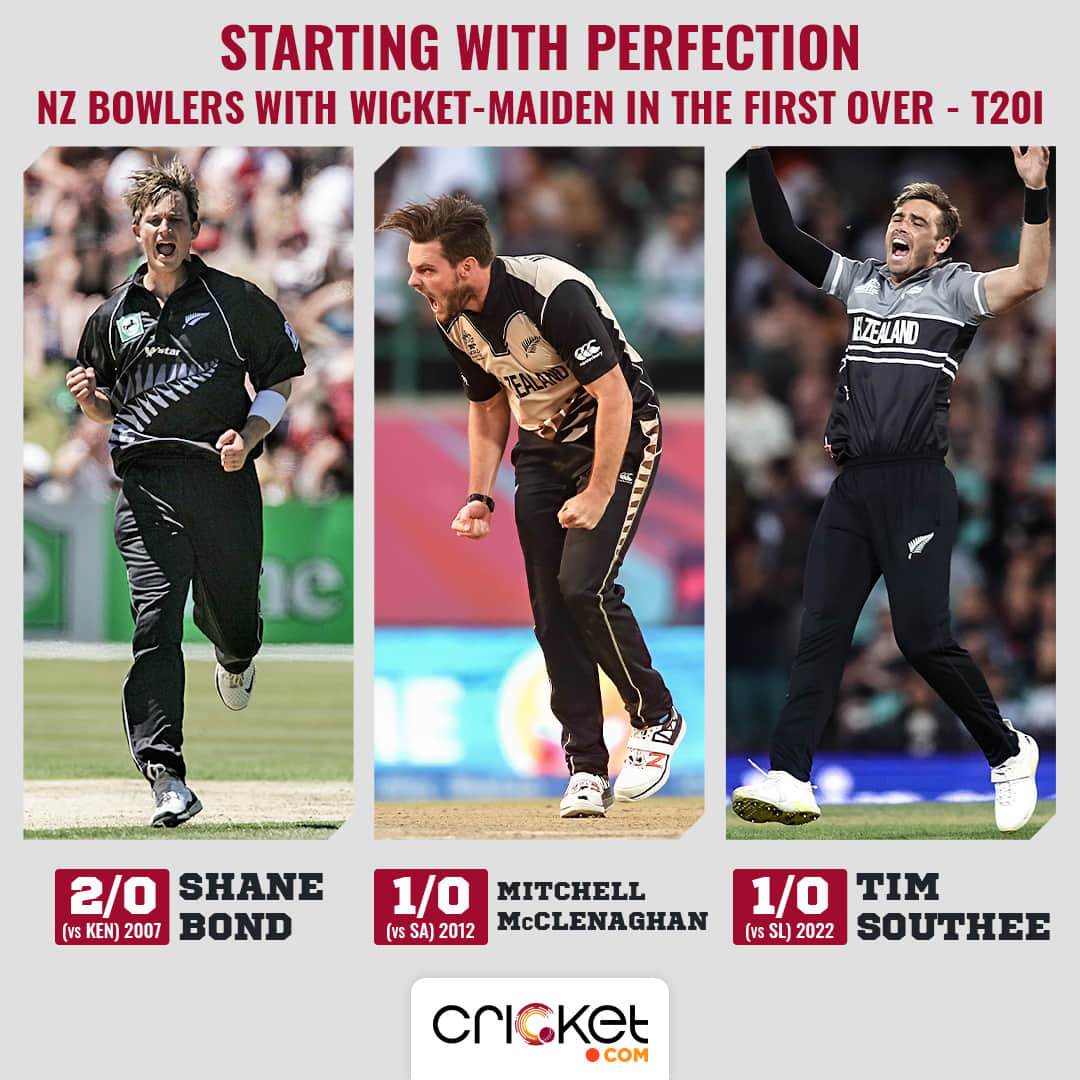 Southee finished his over with a dot and ended up with a wicket-maiden in the first over. In T20Is for New Zealand, Southee became the third bowler to start the innings with a wicket-maiden. The last Kiwi bowler to achieve this feat was Mitchell McClenaghan in 2012 against South Africa.