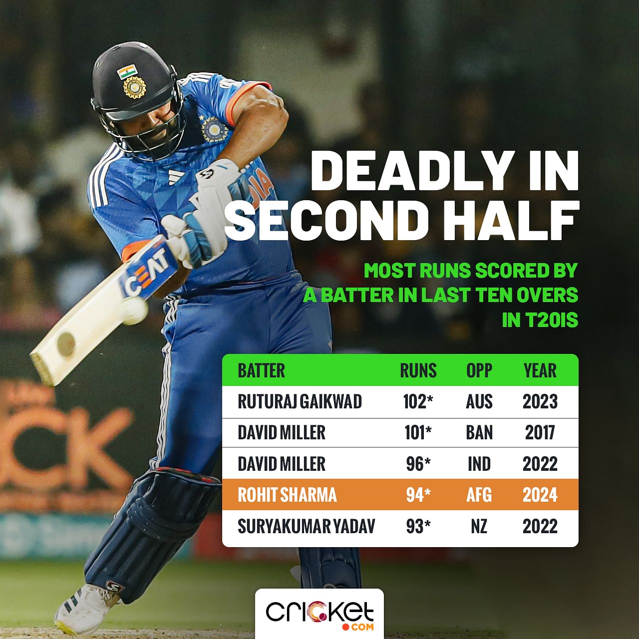 -In the last ten overs, Rohit smashed 94 runs, the fourth-most runs scored by a batter in the second half of the innings in T20Is.
