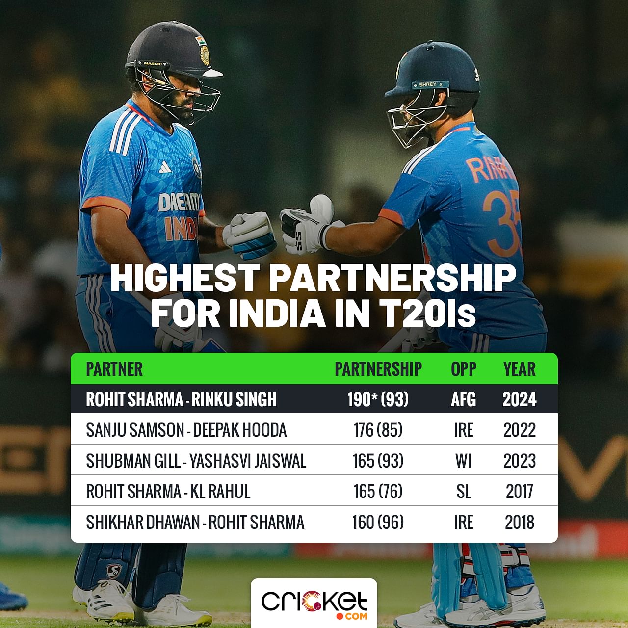 -The unbeaten 190-run partnership between Rinku Singh and Rohit is the highest partnership for India in T20Is.