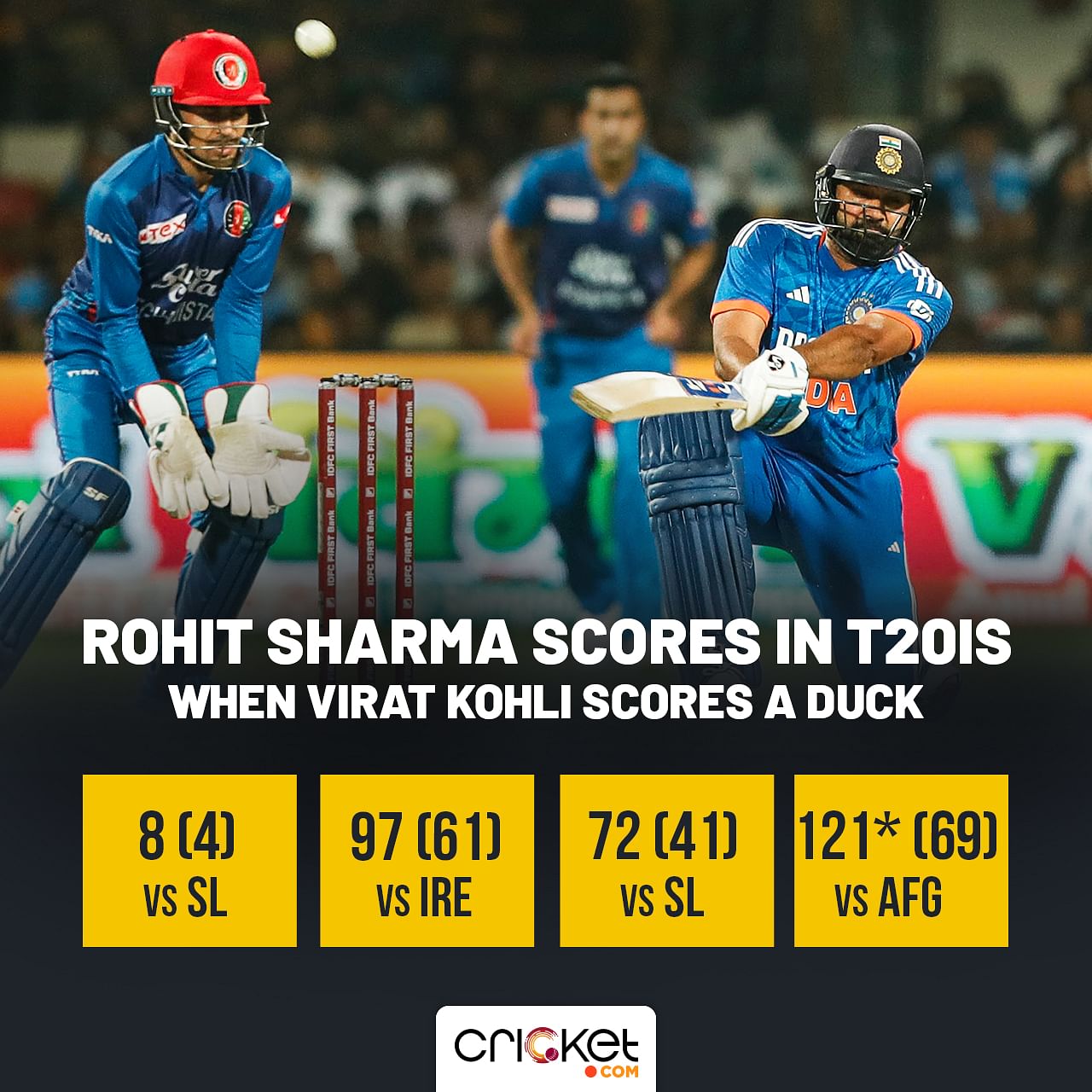 -In total, Kohli has five ducks, and in four of those, Rohit has been in the XI. Out of those four, only once has Rohit scored below 70.