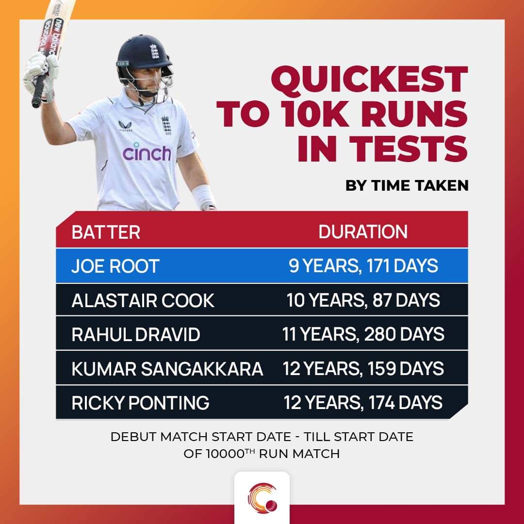 In the first Test against New Zealand, Root, one of the modern-day greats, reached the 10000-run mark, making him the first batter born in the 90’s to achieve the feat. From his debut in December 2012 till the start date of this match, Root took nine years and 171 days to breach the 10k-run barrier. Hence, in terms of time taken, he became the fastest batter.