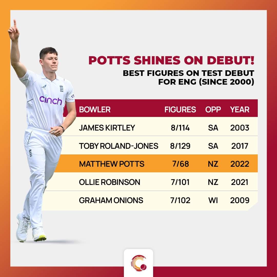 To add more, he had a match figures of 7/68, which is the third best match spell by an England bowler on debut in this century. ICYMI, Potts dismissed Williamson in both innings without conceding a run.