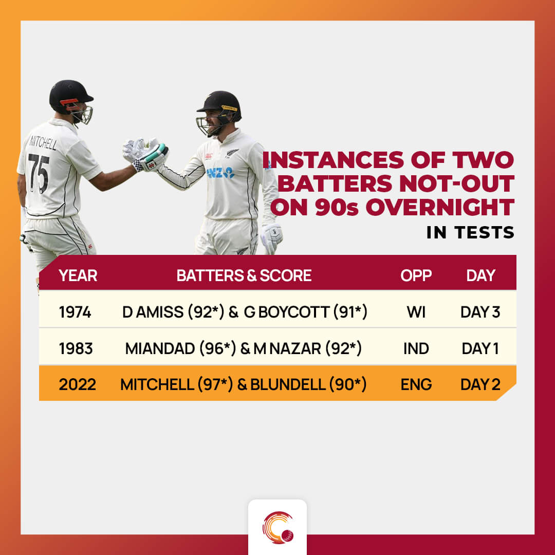 After ensuring a wicket-less third session on day two, Mitchell and Blundell ended the day with a rare stat. Both batsmen were stuck in 90s, Mitchell on 97* and Blundell on 90*. In Tests, this was only the third time where two batters remained unbeaten in 90s overnight.