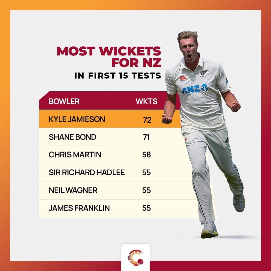In this match, the fast bowler once again piped Bond’s record. In the first 15 Tests, Bond had 71 wickets, the most for a New Zealand bowler. But, with the wicket of Stokes in the second innings, Jamieson went past Bond’s 71 wickets to register the most wickets in the first 15 Tests. To add more, overall, among pacers who have bagged 50+ wickets in their first 15 Tests, his average of 18.5 is the fifth best.