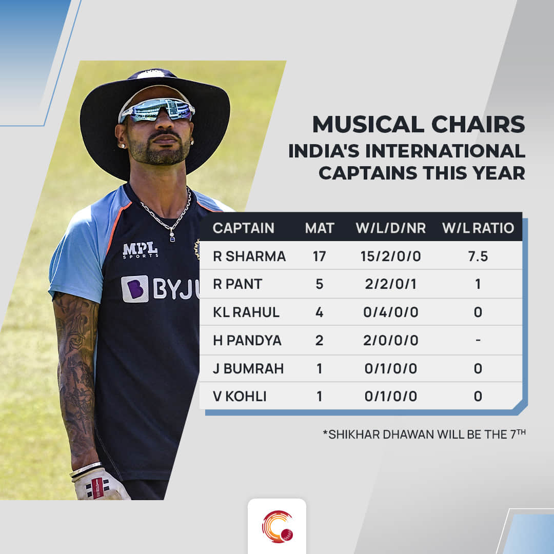 Shikhar Dhawan who is selected to lead India in the ODI series against West Indies, will be the seventh International captain for India this year. In no other calendar year have India had as many captains as 2022. Overall, only Sri Lanka in 2017, had seven different captains.