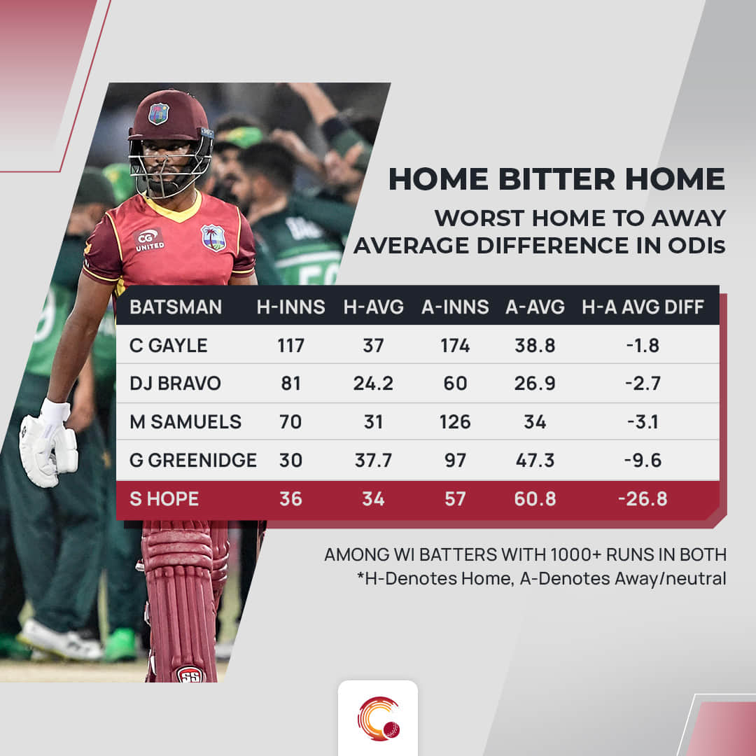 To make things worse, Hope has had contrasting records at home compared to away/neutral matches. In 57 innings outside home, he has scored close to 3000 runs at an average of 60.75. Whereas, in 36 innings at home, he averages only 33.97. Among West Indian batters who have scored 1000+ runs at home and outside, only five have a negative difference ratio and Hope’s ratio of -26.78 is the worst.