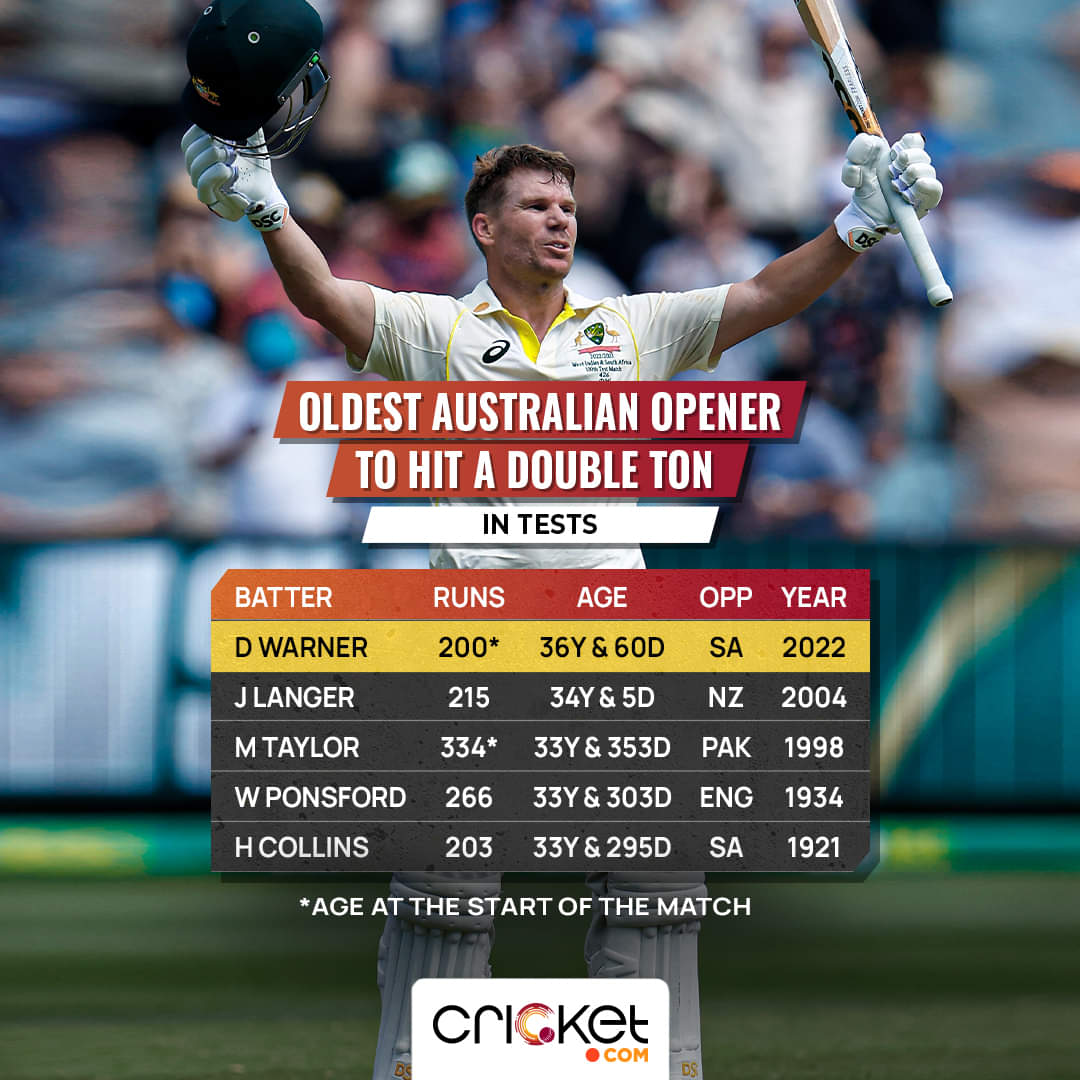 At the age of 36 years and 60 days (at the start of the match), Warner became the first Australian opener to hit a double ton after turning 35. Previously, the oldest was Justin Langer in 2004 against New Zealand (34 years and five days).