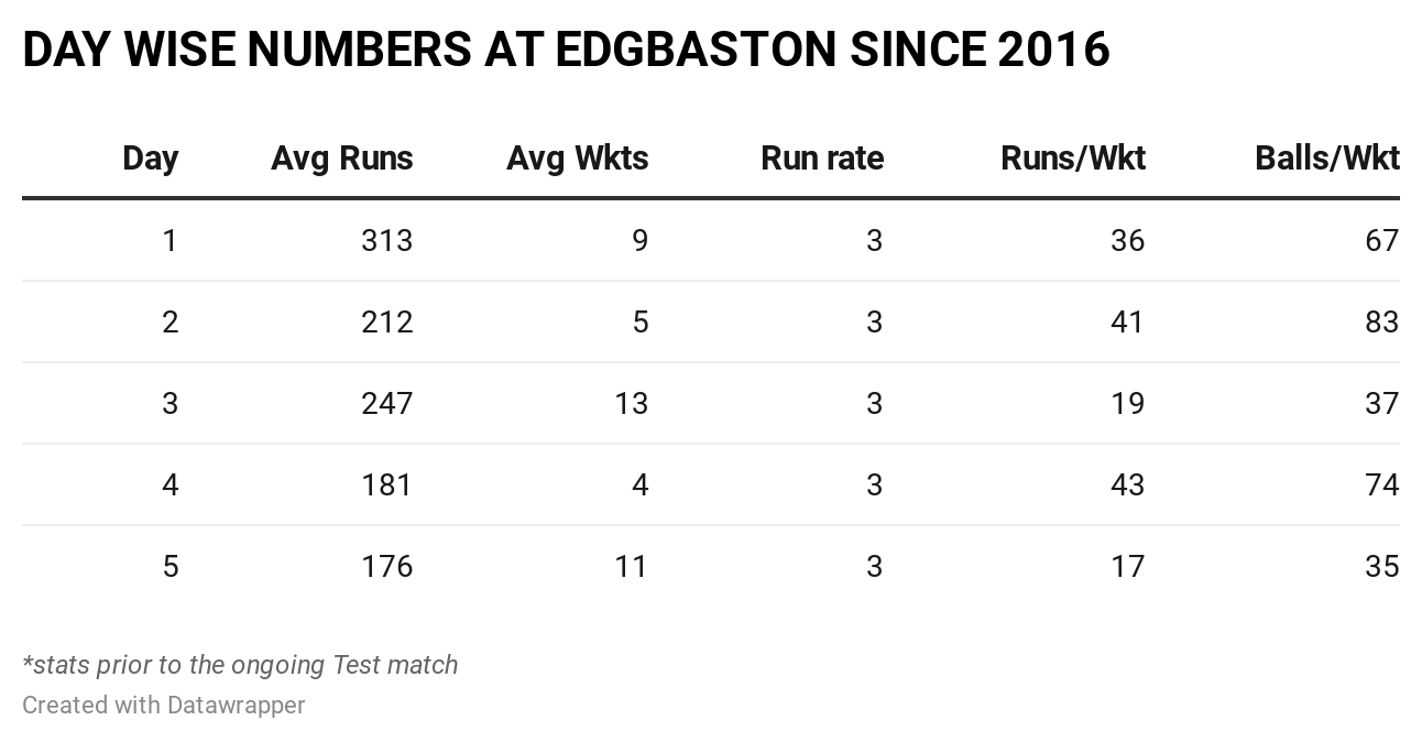 In Tests since 2016, prior to this match, on the first and the second day, teams had scored 35.6 and 40.8 runs per wicket. In terms of balls per wicket, the first day had seen a wicket fall every 66.9 balls and 82.6 on the second. But, on the third day, a wicket has fallen every 19 runs and 37.3 balls. Only on the fifth day, the ratios have been poorer (16.7 runs/wicket and 34.5 balls/wicket), as is the case with most venues. England, already under pressure, need something special from either Bairstow or Stokes, but preferably both.