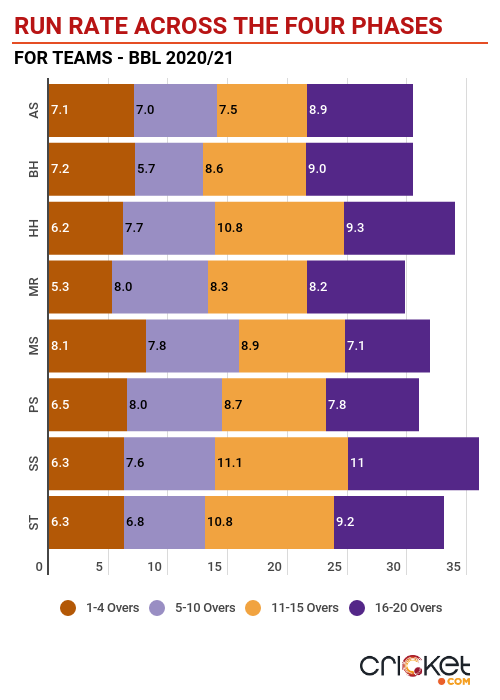 It is just not about losing wickets, Heat have been struggling to score quickly in any of the next three phases. The bowlers seem to have followed a similar pattern. They have been exceptional in the first four overs, bagging a wicket every 12 balls – the joint-best among all teams. As the innings progresses, the performance keeps fading.