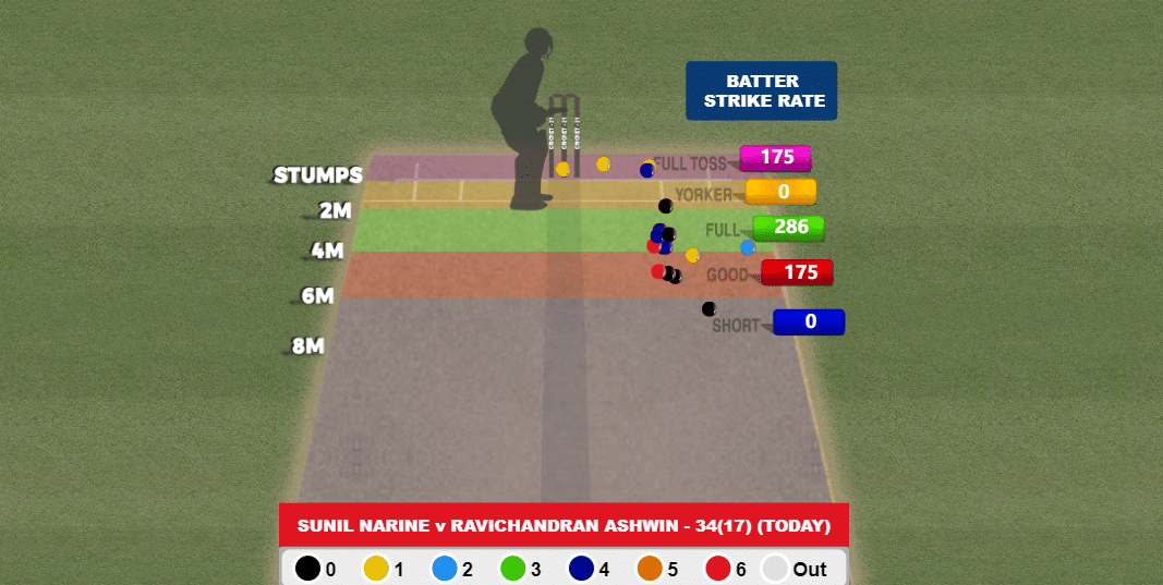 You could see that in Ashwin’s delivery stride that he knew Narine had a wood over him, with a full toss first ball. The second delivery against him was yet again wide, and Narine let it go. But come the third delivery, Narine was ready for it, with a four over the extra cover region. Under pressure, Ashwin tossed it up again but the result was the same.