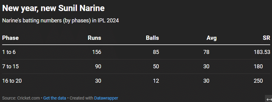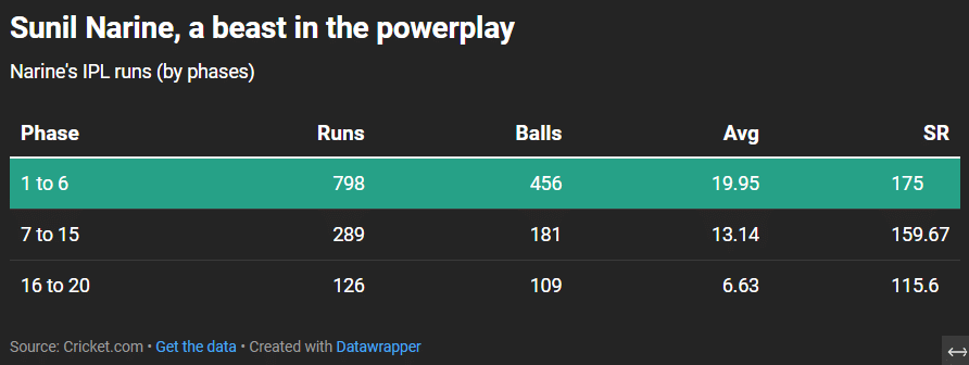 In the middle-overs phase (7-15), he only scored 289 runs, averaging 13.14. So, all the historical evidence backed his tag as a powerplay basher. But Narine has changed that notion, and how.