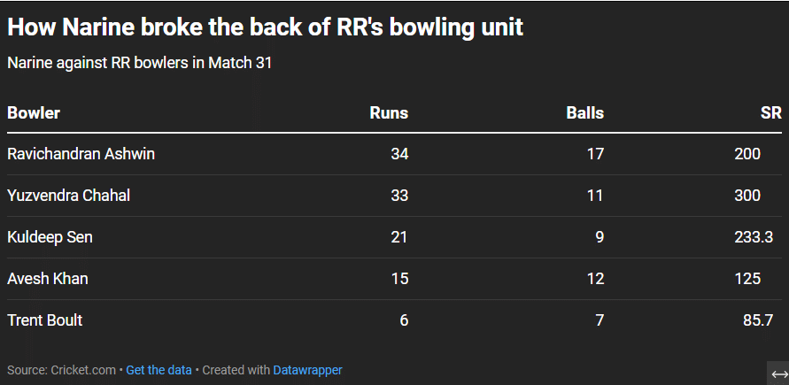 Apart from Ashwin, Narine also took down his spin partner Yuzvendra Chahal, against whom he scored 33 off 11 deliveries, with three sixes and two fours, striking at 300. It was slaughterhouse batting.