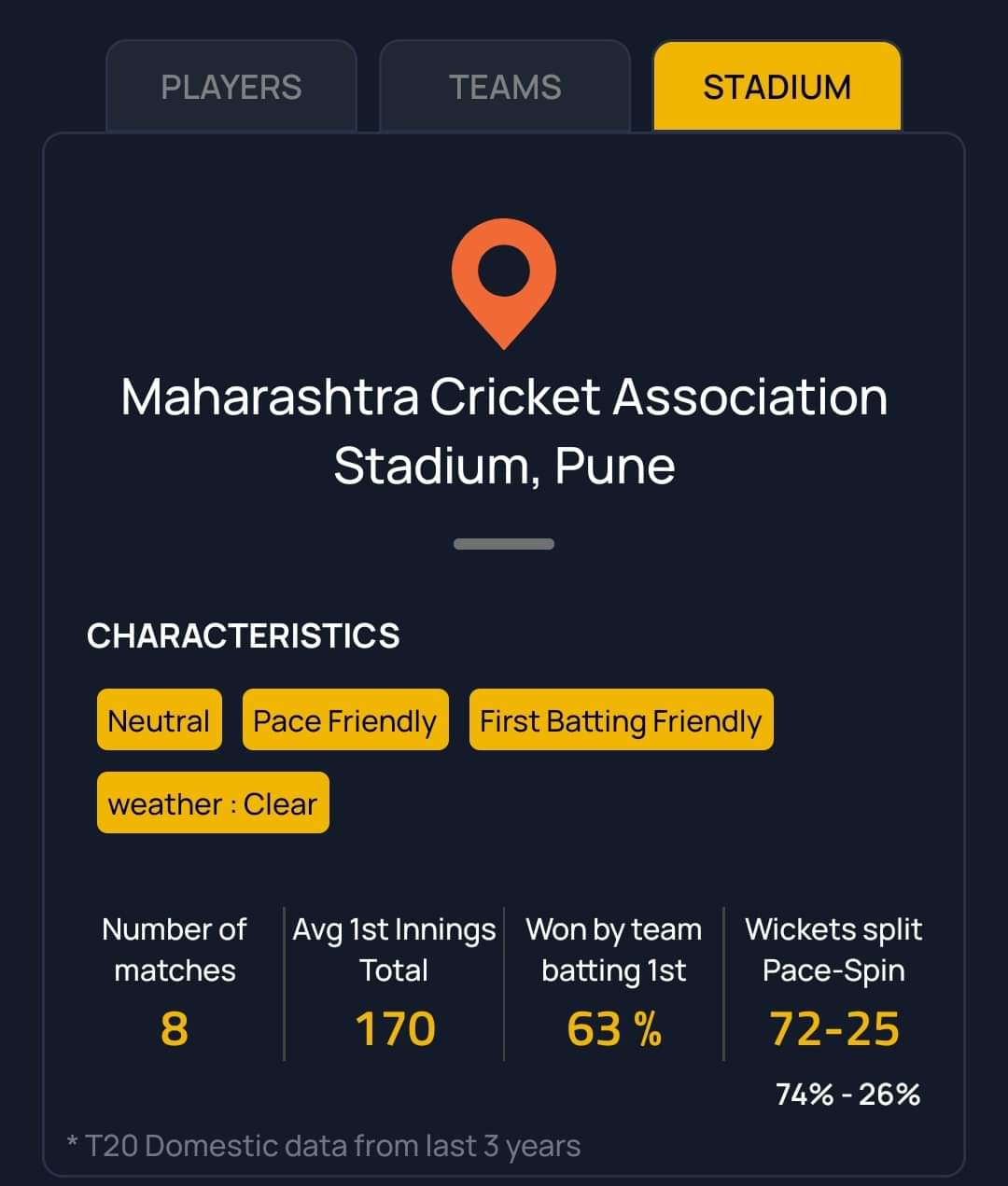 The Maharashtra Cricket Association Stadium has hosted eight games so far and the batters here have scored runs at an average of 24.4, which is the lowest amongst all four venues. Meanwhile, a wicket has fallen every 17.8 deliveries. The fast bowlers have way better numbers than spinners at this venue. They have picked up a wicket every 17.8 deliveries, while spinners here have a strike rate of 24.1. There’s not a single attacking spinner in both teams but it would be ideal to have someone like Maheesh Theekshana in your team.