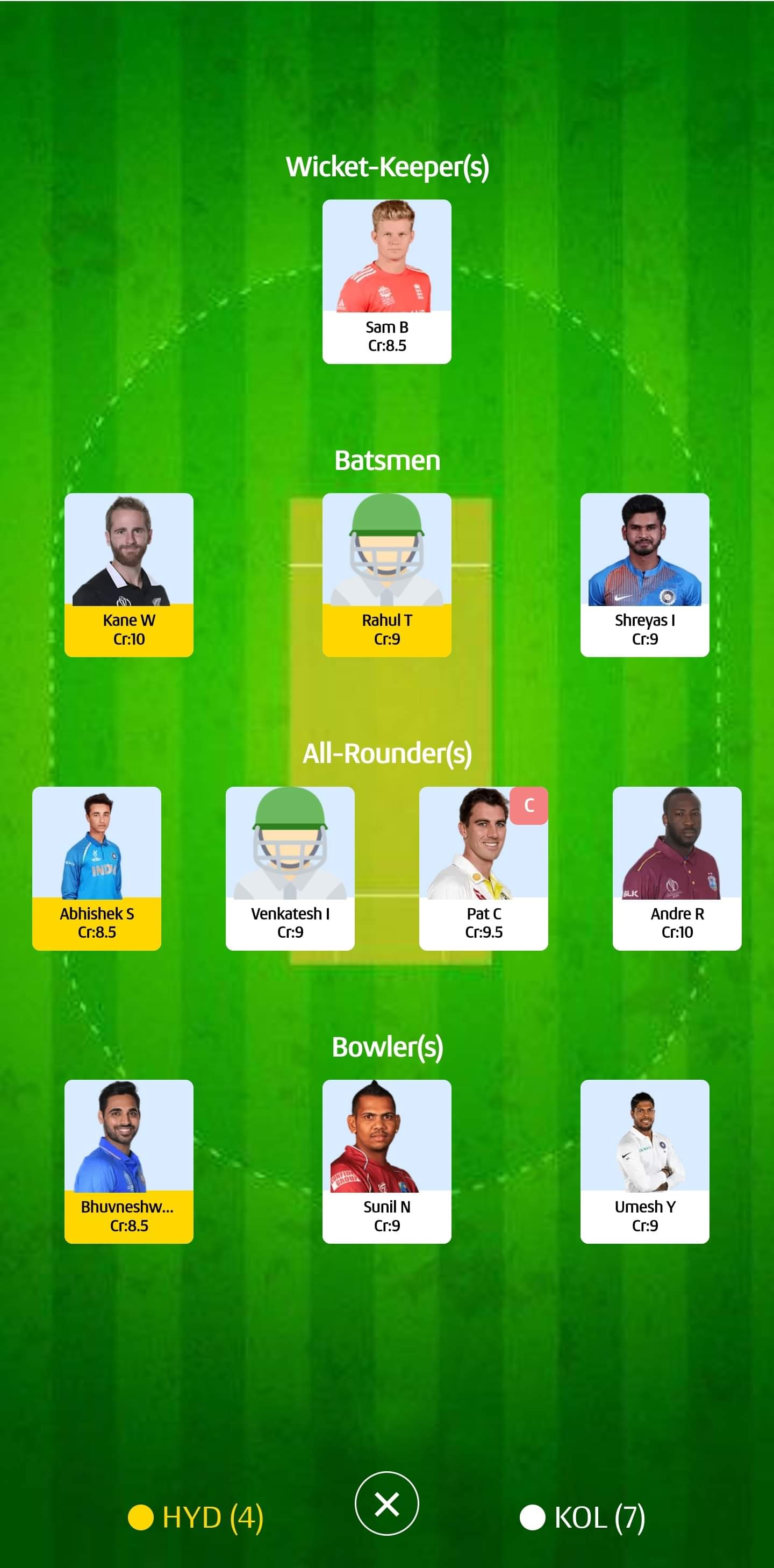 Kolkata Knight Riders: Ajinkya Rahane, Venkatesh Iyer, Shreyas Iyer(c), Sam Billings(w), Nitish Rana, Andre Russell, Sunil Narine, Pat Cummins, Umesh Yadav, Rasikh Salam, Varun Chakravarthy