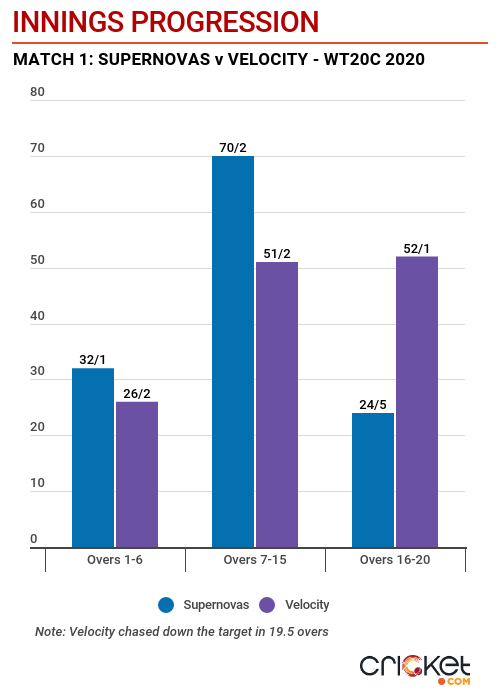 MATCH REPORTVelocity looked down and out at one stage but Sushma Verma and Sune Luus refused to give up and smashed 61 runs in the final six overs to propel their team to an outstanding five-wicket victory over defending champions Supernovas in Match No. 1 of the Women's T20 Challenge 2020 in Sharjah on Wednesday (October 4). It was a satisfying end for Mithali Raj and Co. who lost to the same opponent in the final of the 2019 edition.