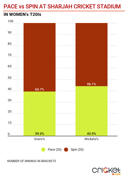 As is usually the case, irrespective of conditions, spinners bowl most of the overs. In Sharjah, spinners have bowled 60.7 percent of the overs as compared to 39.3 by pacers. The wickets section is also dominated by spinners, but pacers have a better average and strike rate.