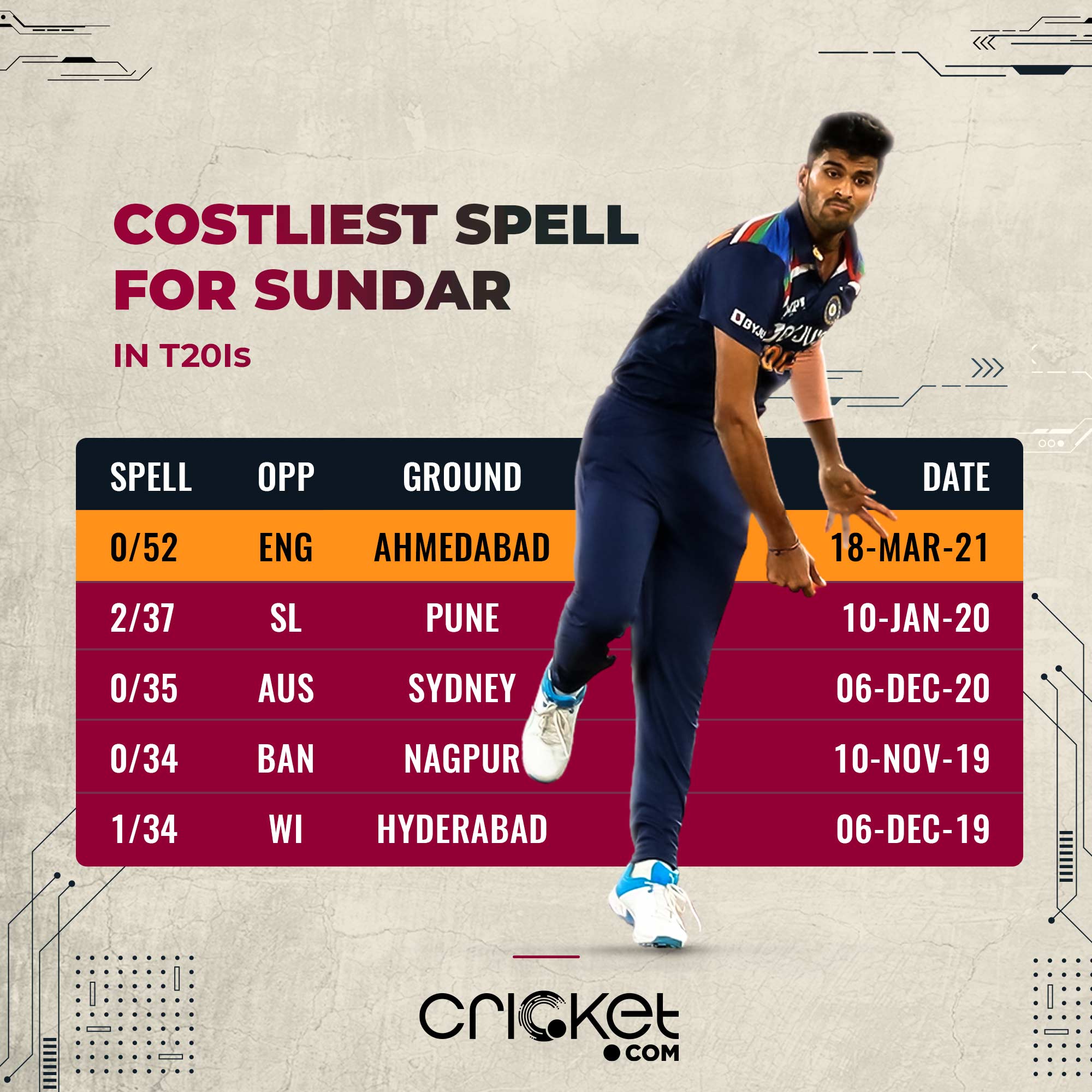 Washington Sundar is generally a miser when it comes to giving away runs of his bowling, let be in internationals or in domestic. However, today wasn’t his day. For the first time in his T20 career, Sundar registered a half-century in terms of runs conceded.