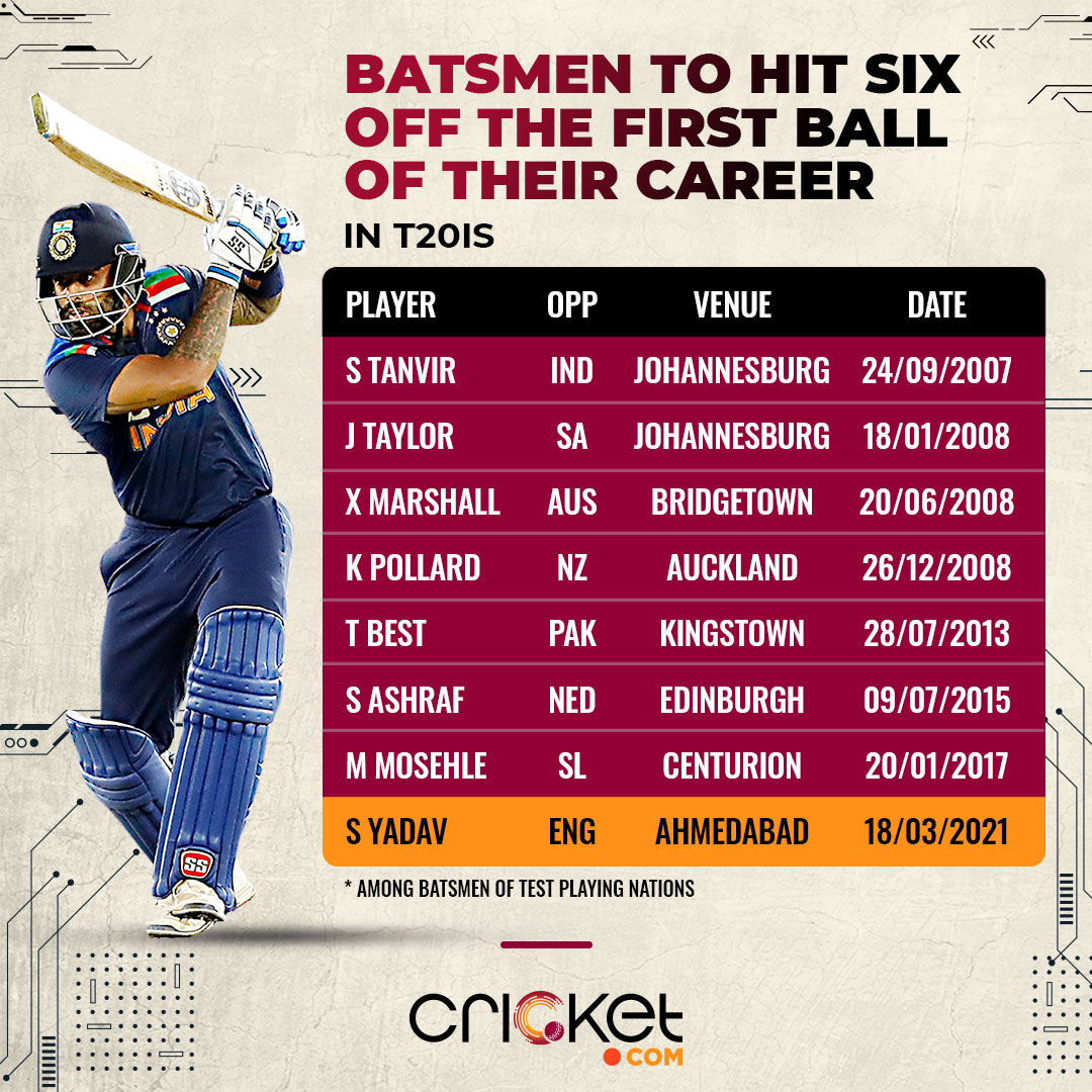 He hit a six off the only delivery he faced in his debut innings against Sri Lanka in 2017 in Centurion. In addition, among the Test-playing nations, Surya is the fourth player after Sohail Tanvir, Mark Craig and Mosehle to open their tally of runs with the six off their first delivery faced in internationals.