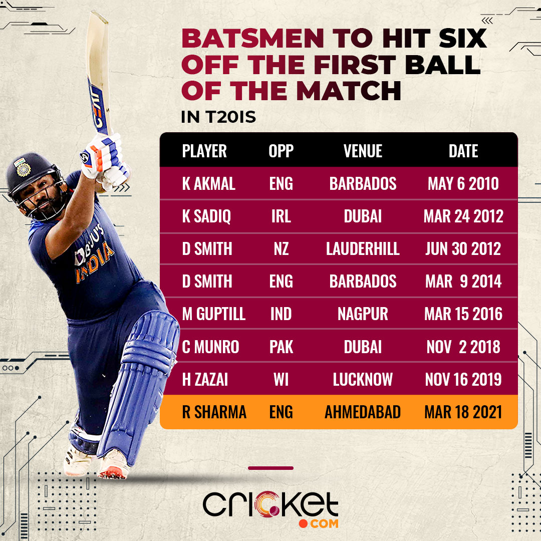 STATS HIGHLIGHTSRohit becomes the first Indian to hit a six off the first ball of the match