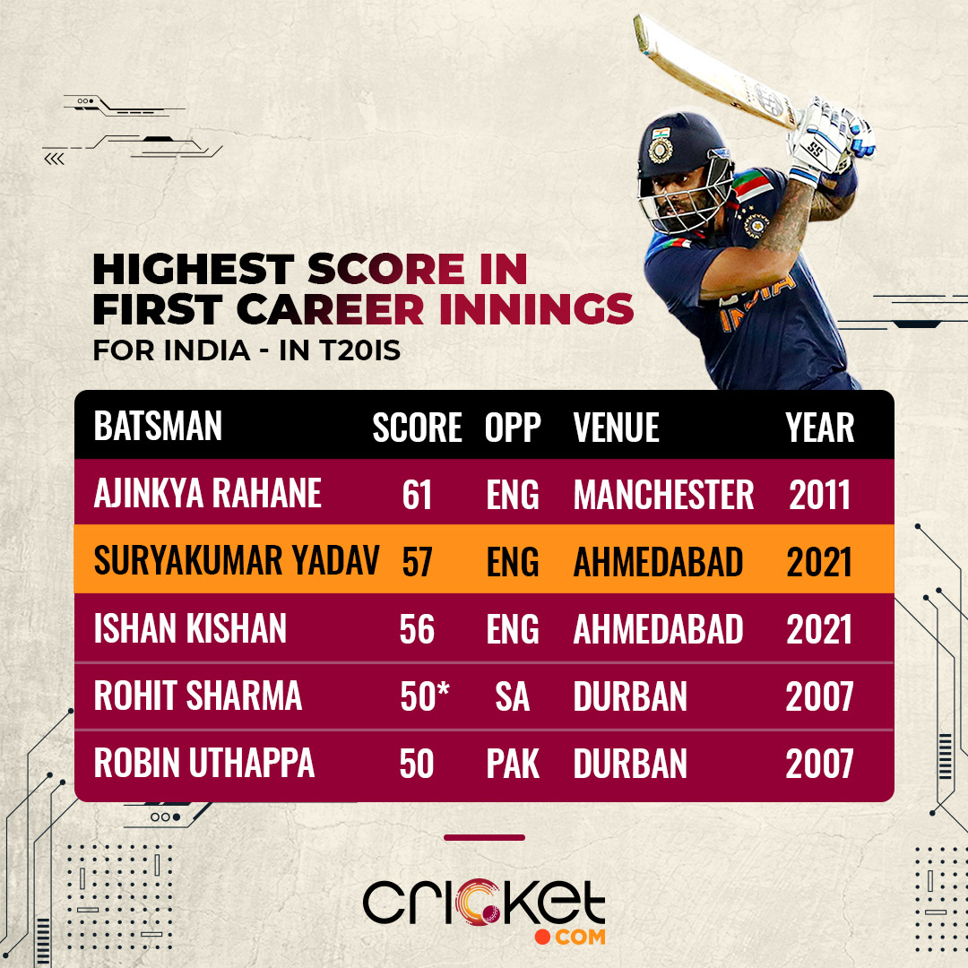 It was certainly evident by the way he started off. By reaching his half-century off 28 balls, Surya became the fifth Indian batsman in T20Is to register a 50+ score in his first innings. His score of 57 is the second-highest amongst those five batsmen. Ajinkya Rahane’s 61 against England in 2011 in Manchester still remains the highest.