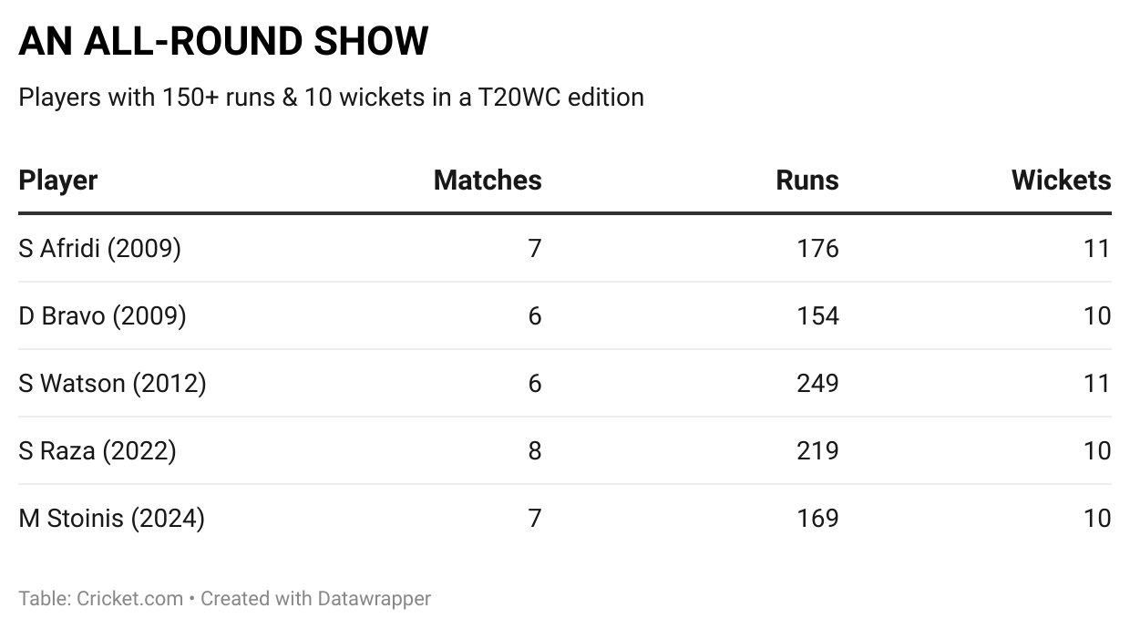 Marcus Stoinis chipped in with bat and/or ball in every match he played in. Overall, he is only the fifth player and the second Australian to score 150+ runs and pick up 10+ wickets in a single edition of the T20 World Cup.