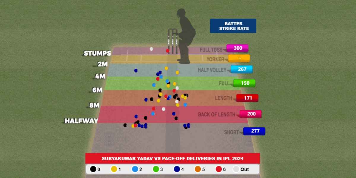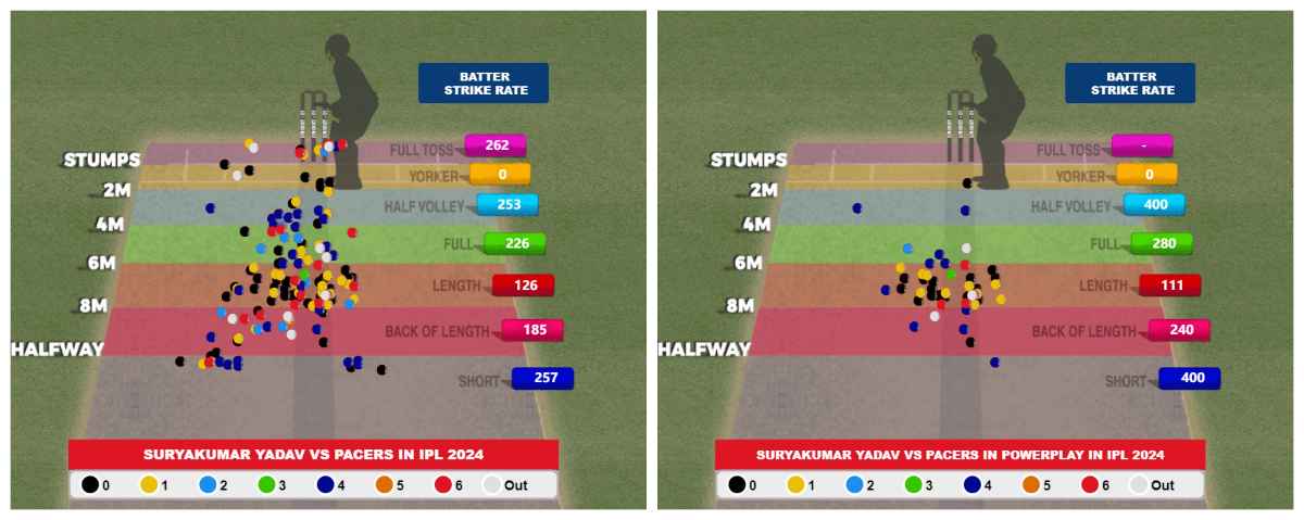 In IPL 2024, SKY faced 58 slower deliveries from quicks, and smashed 122 runs at a strike rate of 210. Against slower deliveries that were 6m or shorter, he averaged 44 and struck at 209.5, getting dismissed just twice.