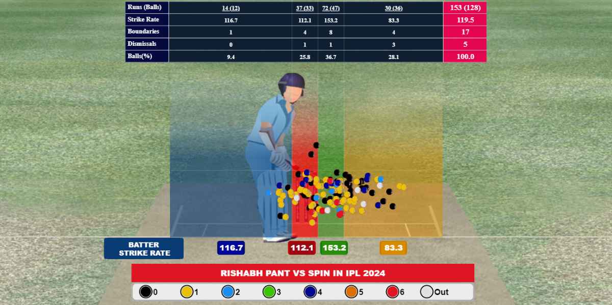 Pant, in IPL 2024, faced 128 balls of spin and managed just 153 runs at an average of 30.6 and strike rate of 119.5.