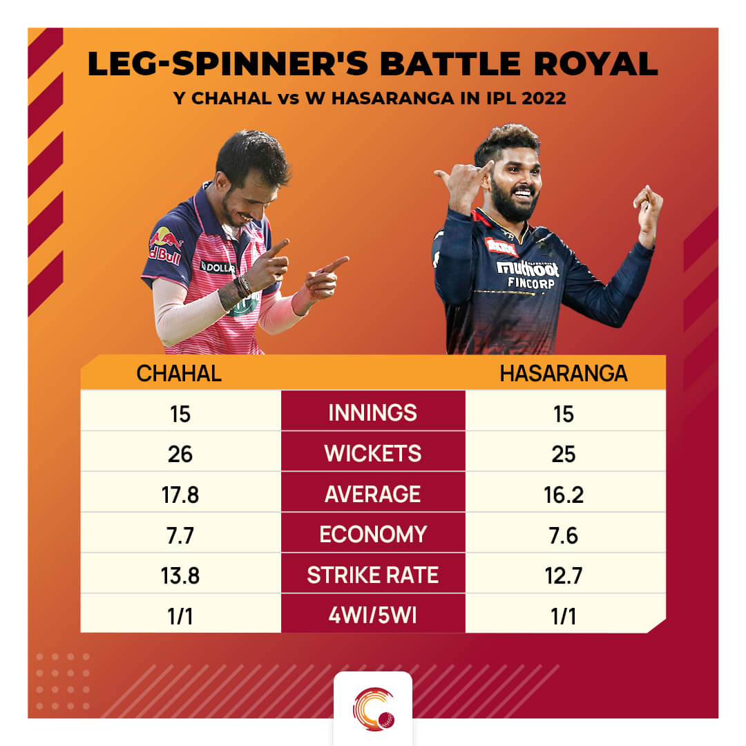 Both leg spinners are different in nature. Chahal is more of a bowler who believes in deceiving the batters through his flight and dip and Hasaranga through variations. In this battle, Chahal (26) is one wicket ahead of Hasaranga (25).