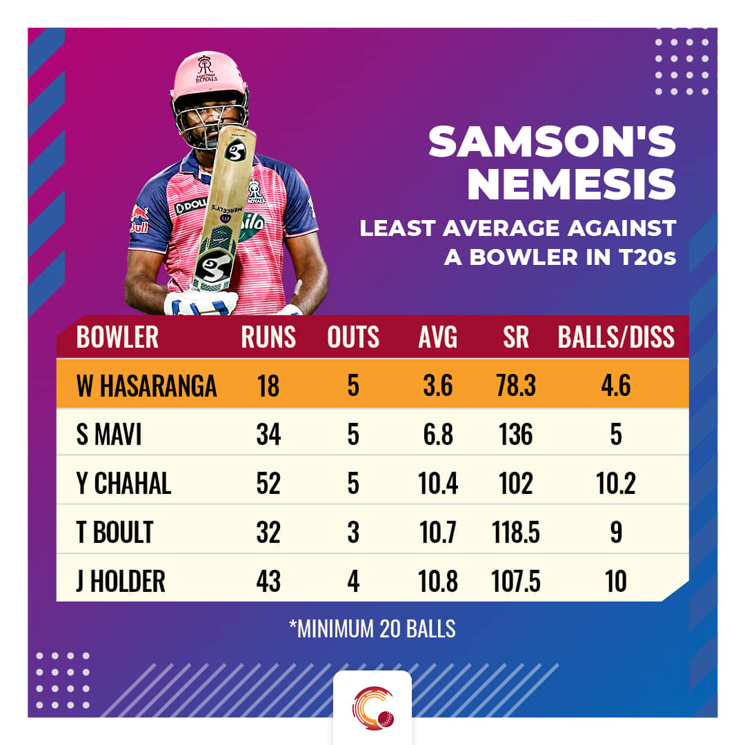However, Bangalore has the perfect nullifier and the name is Hasaranga. In T20s, Samson has been dismissed by Hasaranga five times in six innings. In both the league stage matches, Hasaranga accounted for his wicket. Overall, in T20s, Samson averages only 3.6 against the bowler and has been dismissed every 4.5 balls. Against a bowler whom Samson has played 20+ balls, his average and balls/dismissal ratio are his worst against a particular bowler.
