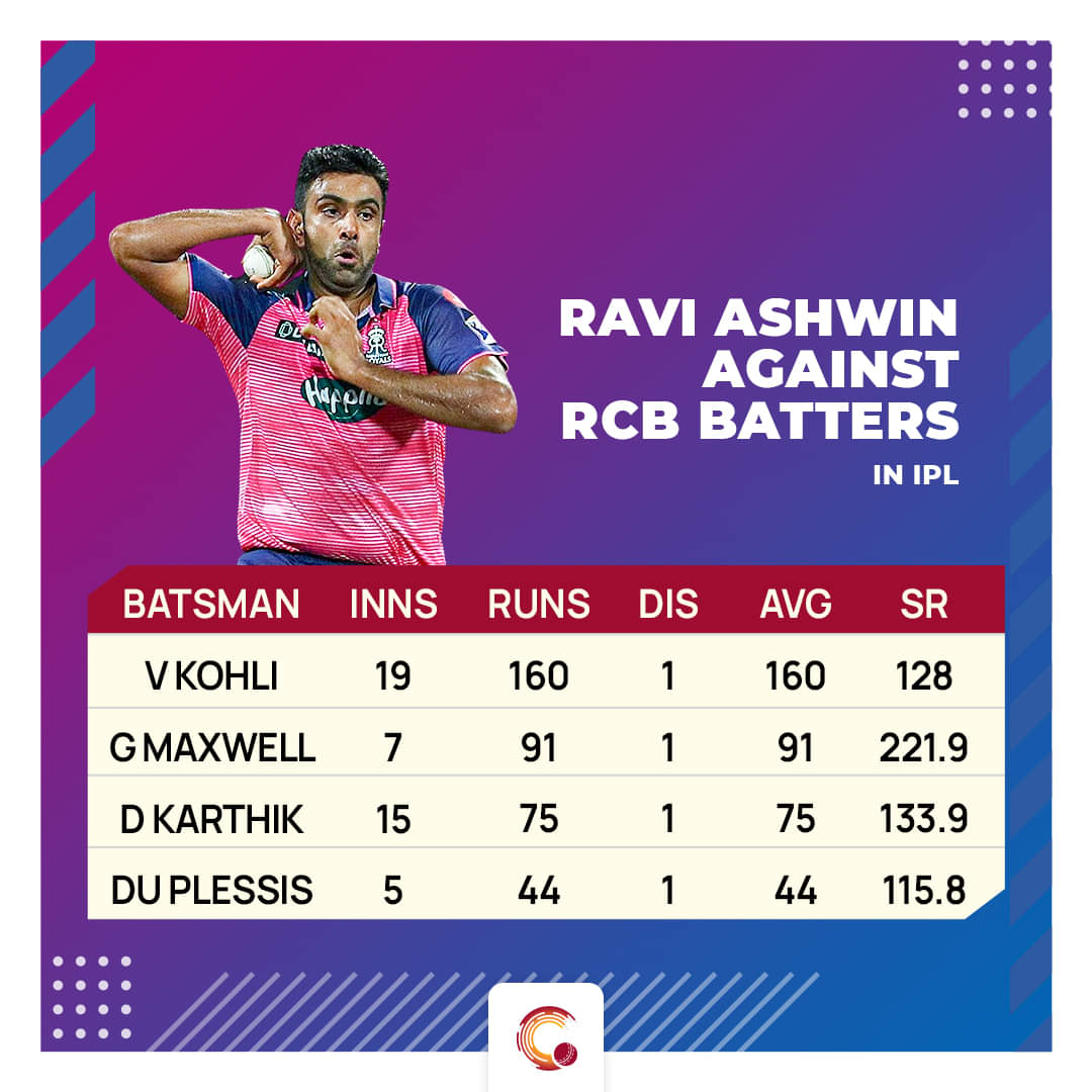 In any case, he will be up against a team that has a batting order full of his nemesis. Bangalore’s best four batters, Kohli, Faf du Plessis, Glenn Maxwell, and Dinesh Karthik, have played 30+ balls against Ashwin in IPL and have no more than one dismissal. Maxwell among the lot has been the most brutal one. He has scored over 90 runs with one dismissal at a strike rate of 221.9. The remaining three have a decent strike rate against Ashwin.