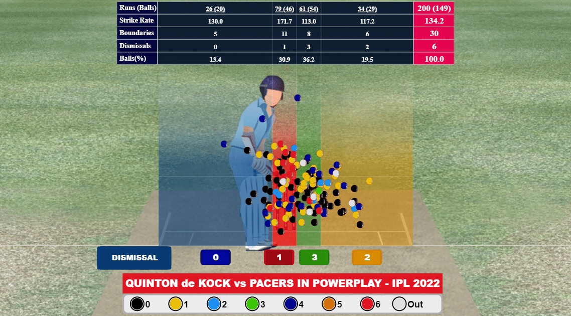 In the powerplay, de Kock’s strength is when bowlers have bowled on the stumps. He has been dismissed only once against pacers and has struck at 171.8.
