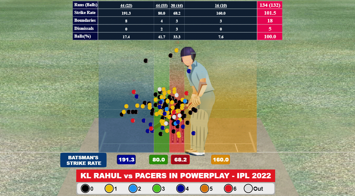 However, when bowled on the fourth-sixth stump line, he strikes at 113, and against wide outside off deliveries, he has a strike rate of 117.2. His five out of the six dismissals inside the powerplay have come when bowlers have bowled these lines.
