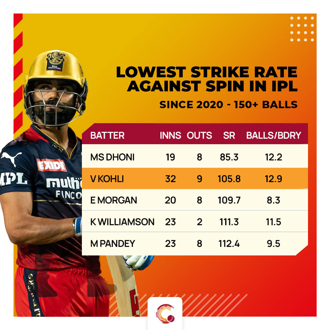 This weakness is something that has been ailing Kohli for the past three seasons. In IPL since 2020, among batters who have faced 150+ balls against spin, only MS Dhoni (85.3) has a lower strike rate than Kohli’s 105.8. To worsen it more, his balls/boundary ratio of 12.9 against spinners is the worst in this category. In this edition, among batters with 75+ balls against spin, his average of 24.5 and strike rate of 107.7 is the second-lowest.