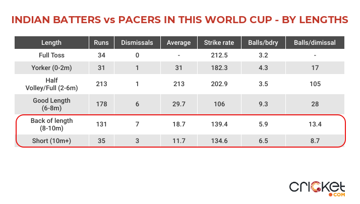 That’s a big worry for India. The strength of England pacers in this WC has been the Indian batters’ weakness. From back-of-a-length (BOL) delivery against pacers, Indian batters have lost seven wickets at an average of 18.7 and a balls/dismissal ratio of 13.4. Further, when bowled short, they have lost three wickets at an average of 11.7 and a balls/dismissal ratio of 8.7, their worst against pacers on any length. In fact, their balls/dismissal ratio of 13.4 against BOL is the worst for any team in this WC.
