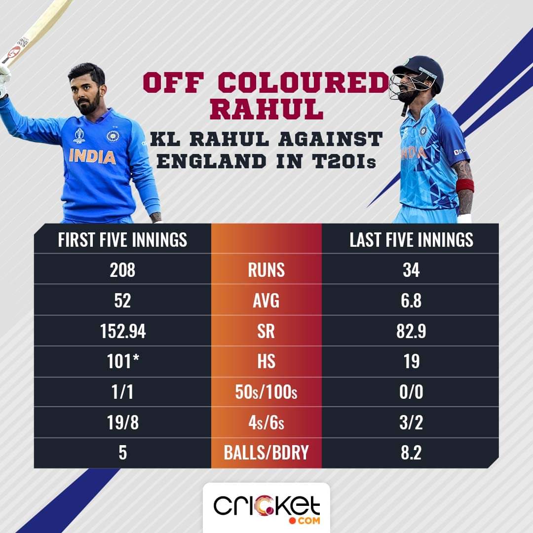 In T20Is, Rahul has scored 242 runs at an average of 26.9 and a strike rate of 136.7 in 10 innings against England. His overall record might be decent, but his recent numbers have been horrendous.